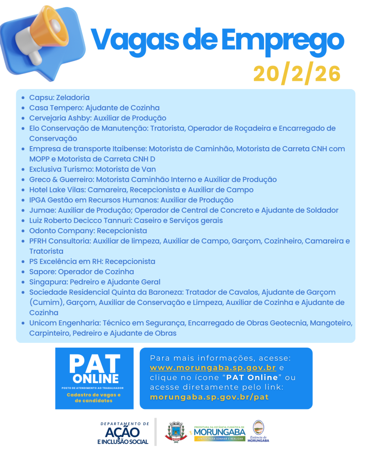 Para mais informações e cadastro de vagas, acesse: morungaba.sp.gov.br/pat