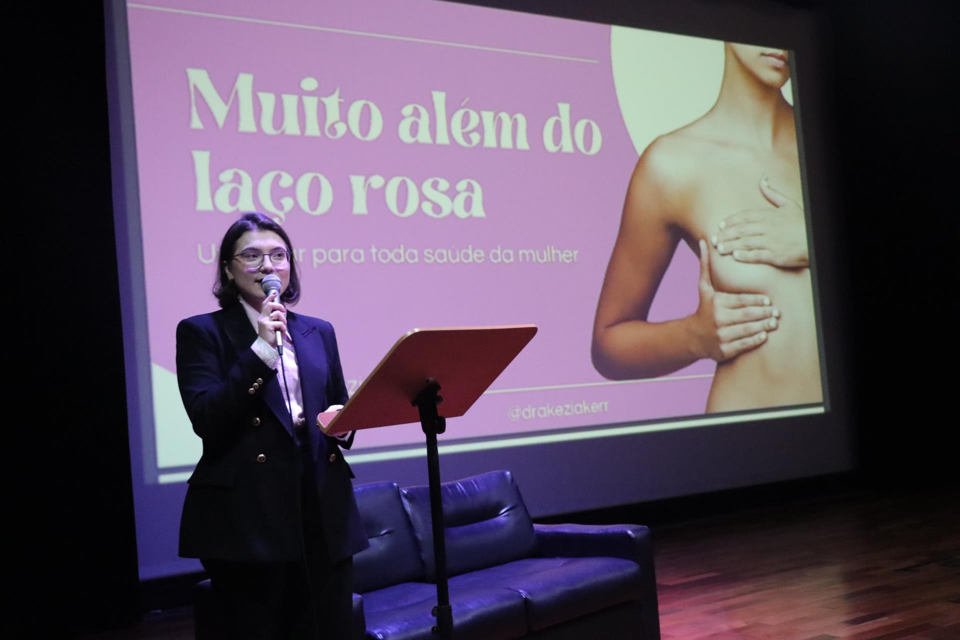 Ela levou ao público presente uma reflexão sobre o cuidado integral da mulher, destacando a necessidade de olhar para a saúde feminina em suas dimensões física, mental e emocional, ressaltando a importância da prevenção e do rastreamento precoce de doenças.
