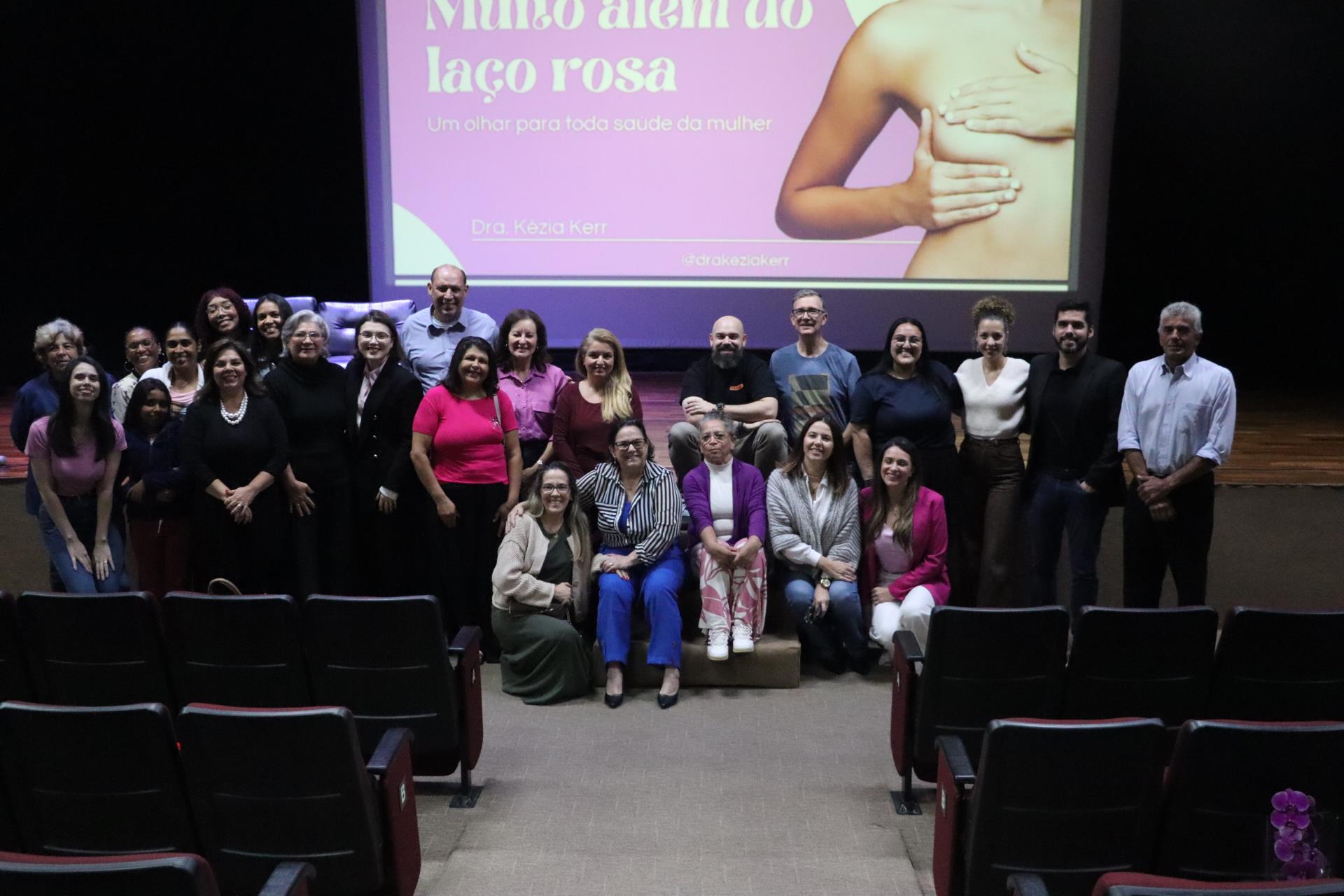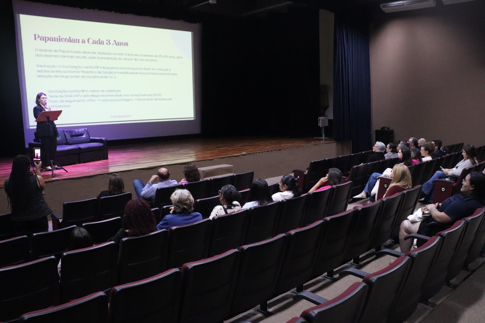 A palestra, intitulada "Muito Além do Laço Rosa: Um Olhar para Toda a Saúde da Mulher", foi ministrada na noite desta sexta-feira (31/10), no Teatro Municipal Fioravante Frare.