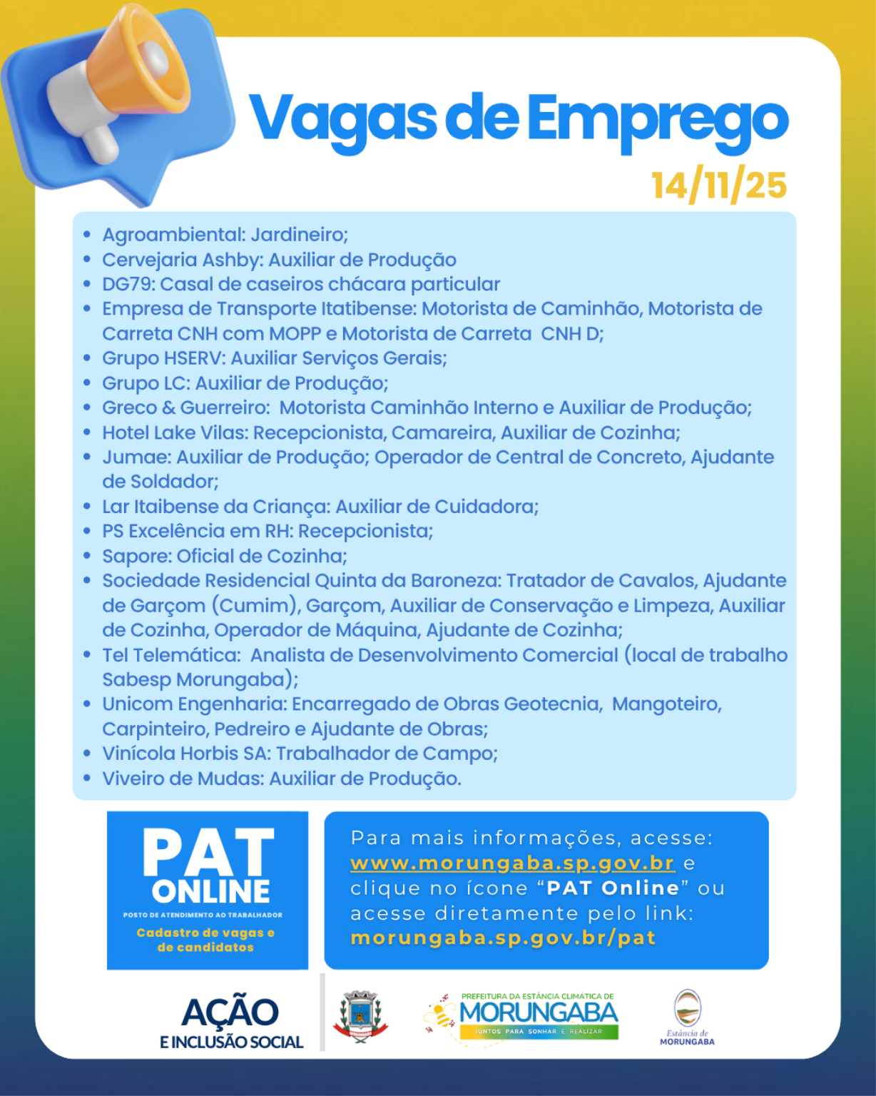 PREFEITURA DIVULGA AS VAGAS ATIVAS DO PAT DE MORUNGABA - 14/11/25