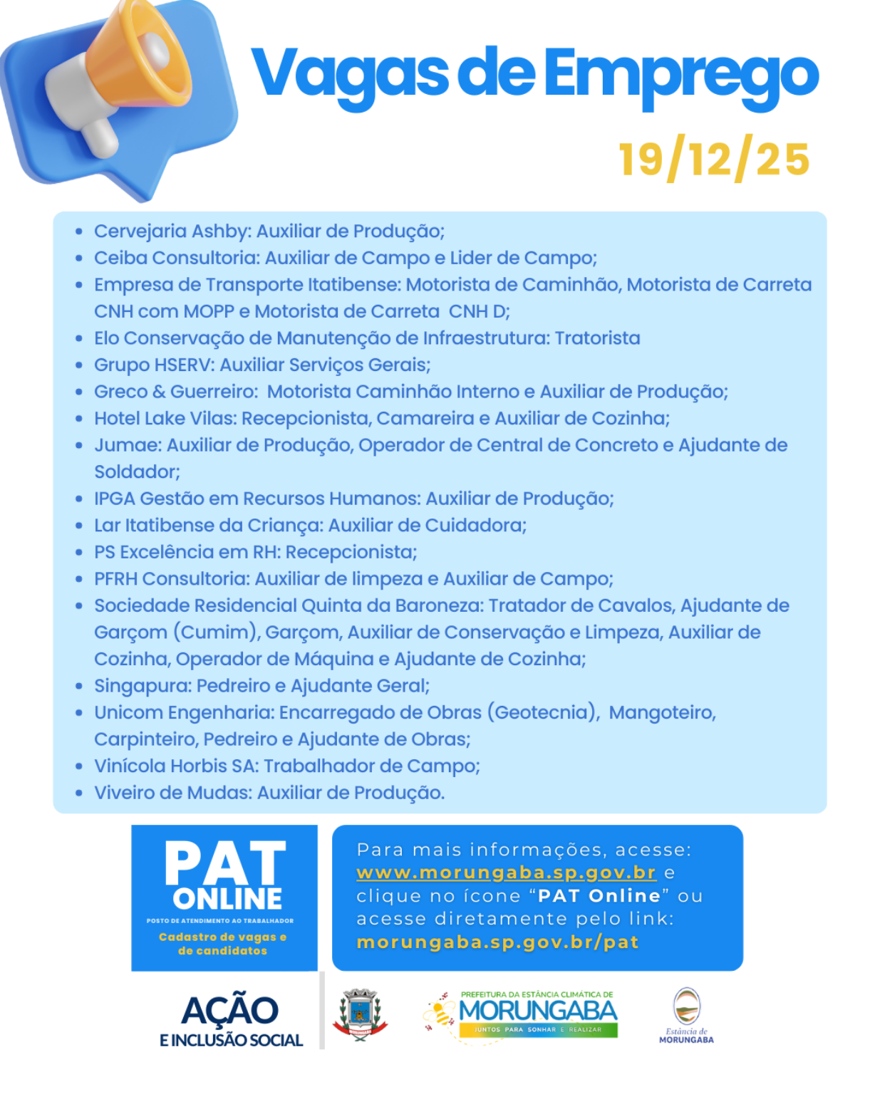 PREFEITURA DIVULGA AS VAGAS ATIVAS DO PAT DE MORUNGABA - 19/12/25