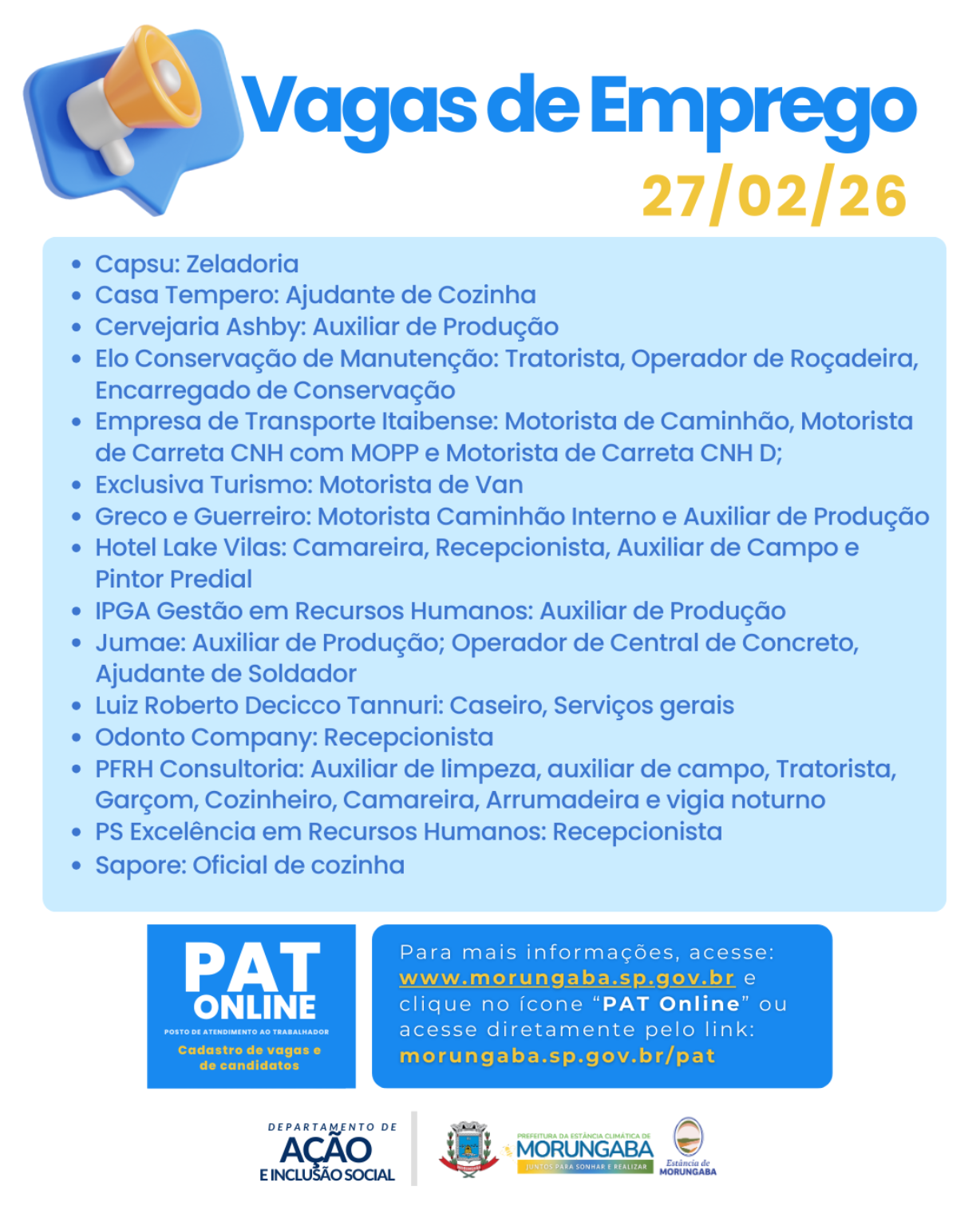 VAGAS DE EMPREGO – PAT MORUNGABA - 27/02/2026
