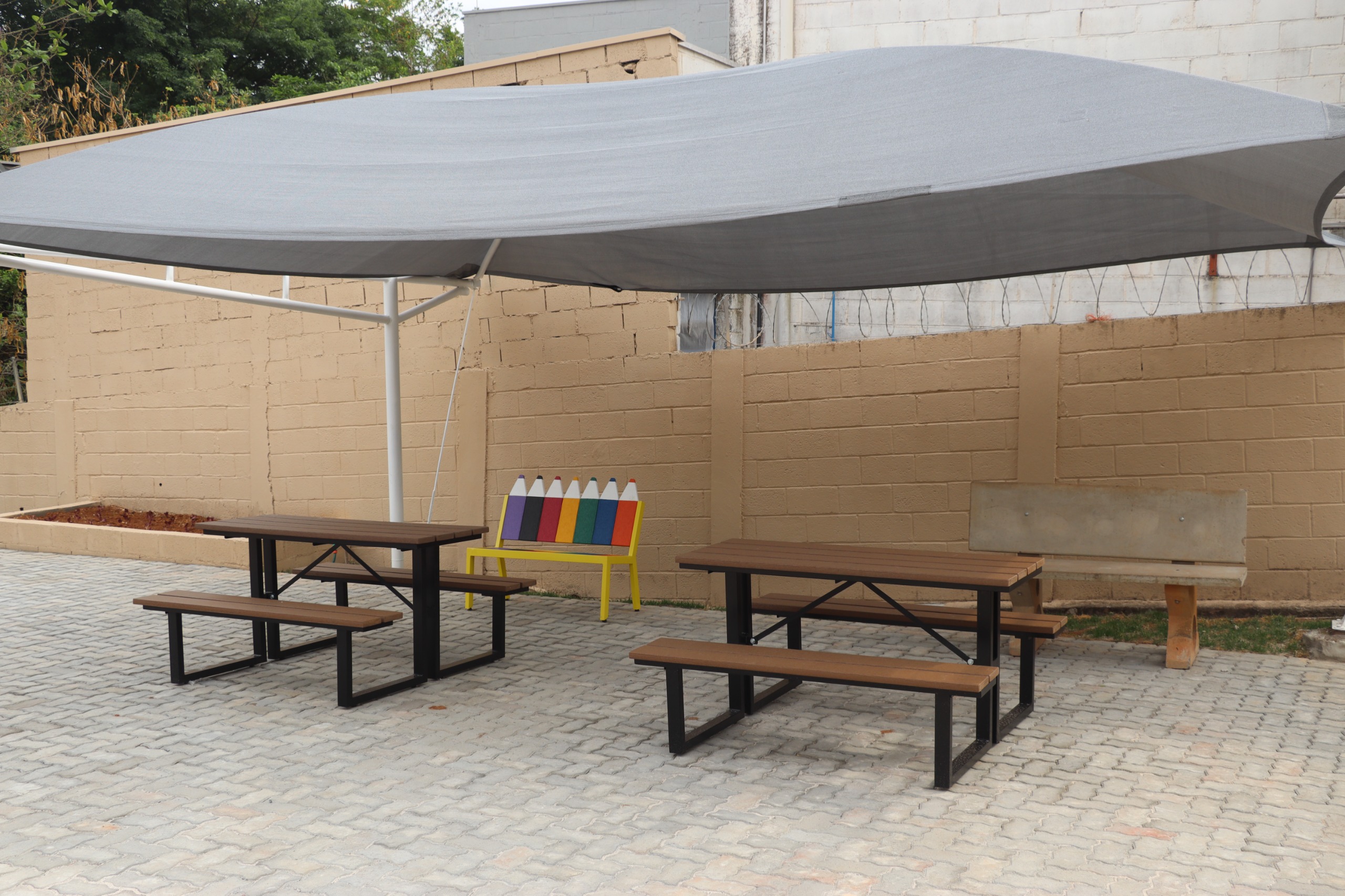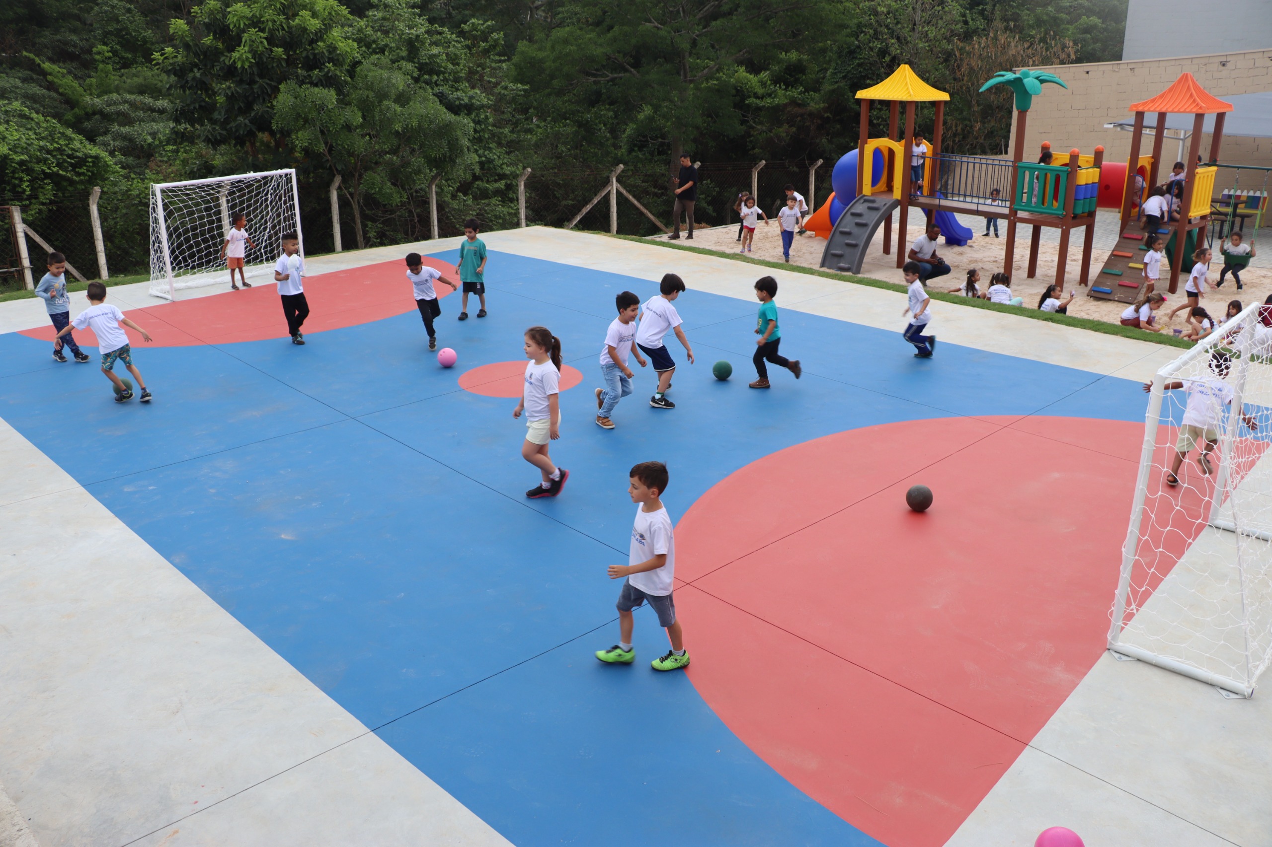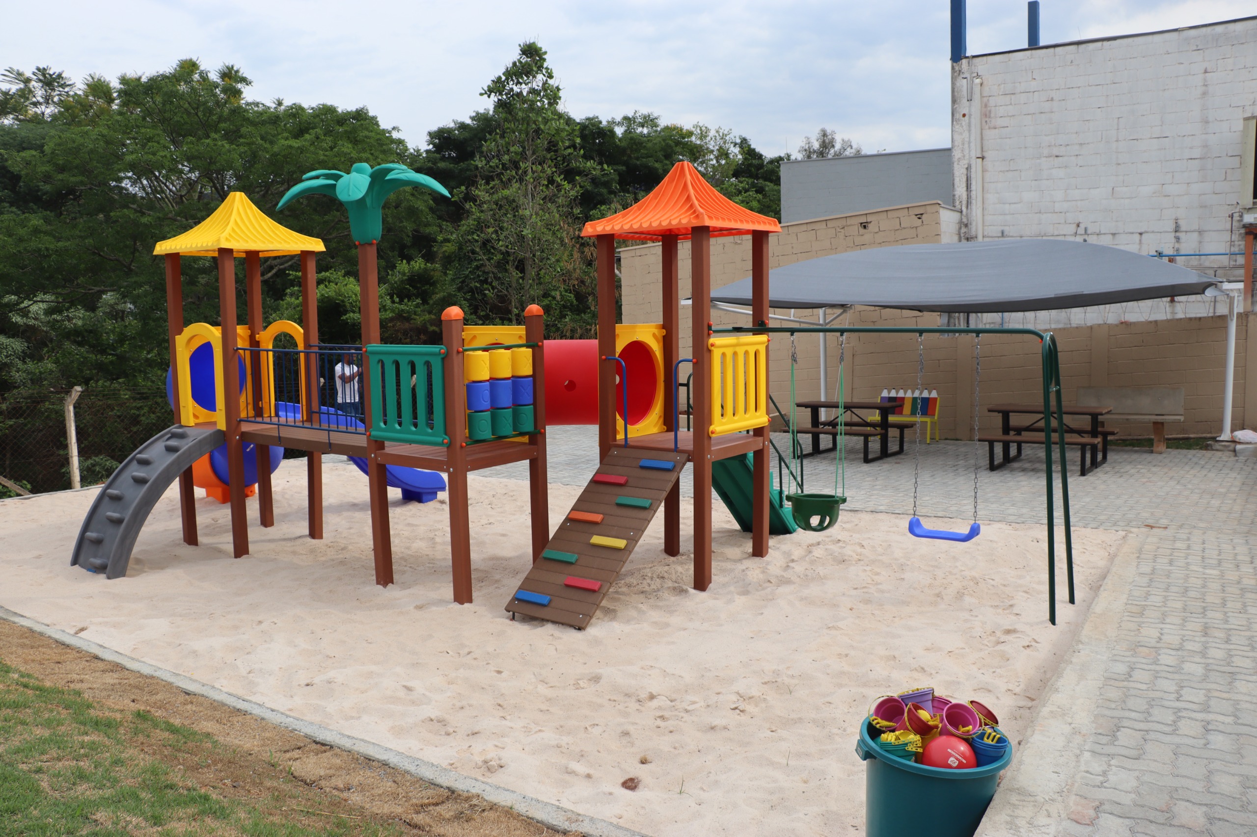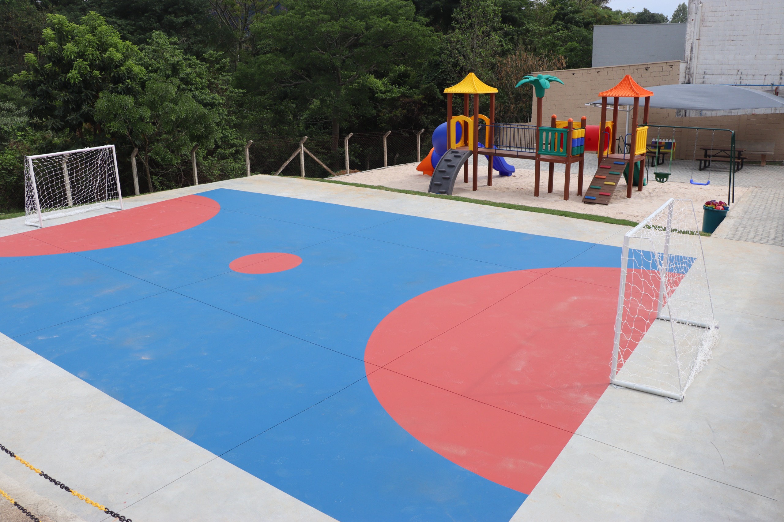 O novo espaço de lazer foi totalmente revitalizado, recebendo novos brinquedos, parque de areia e melhorias na estrutura, garantindo mais segurança e conforto aos alunos.