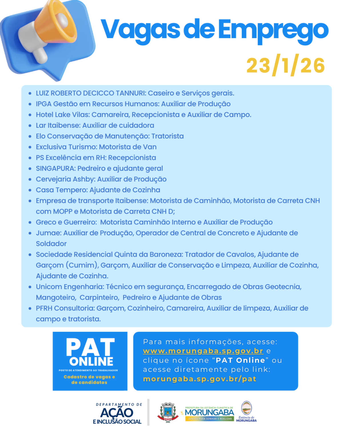 O PAT de Morungaba, por meio do Departamento de Ação e Inclusão Social, divulga as vagas de emprego disponíveis, conforme atualização de 23 de janeiro de 2026. Confira abaixo todas as empresas e cargos, exatamente como informados: